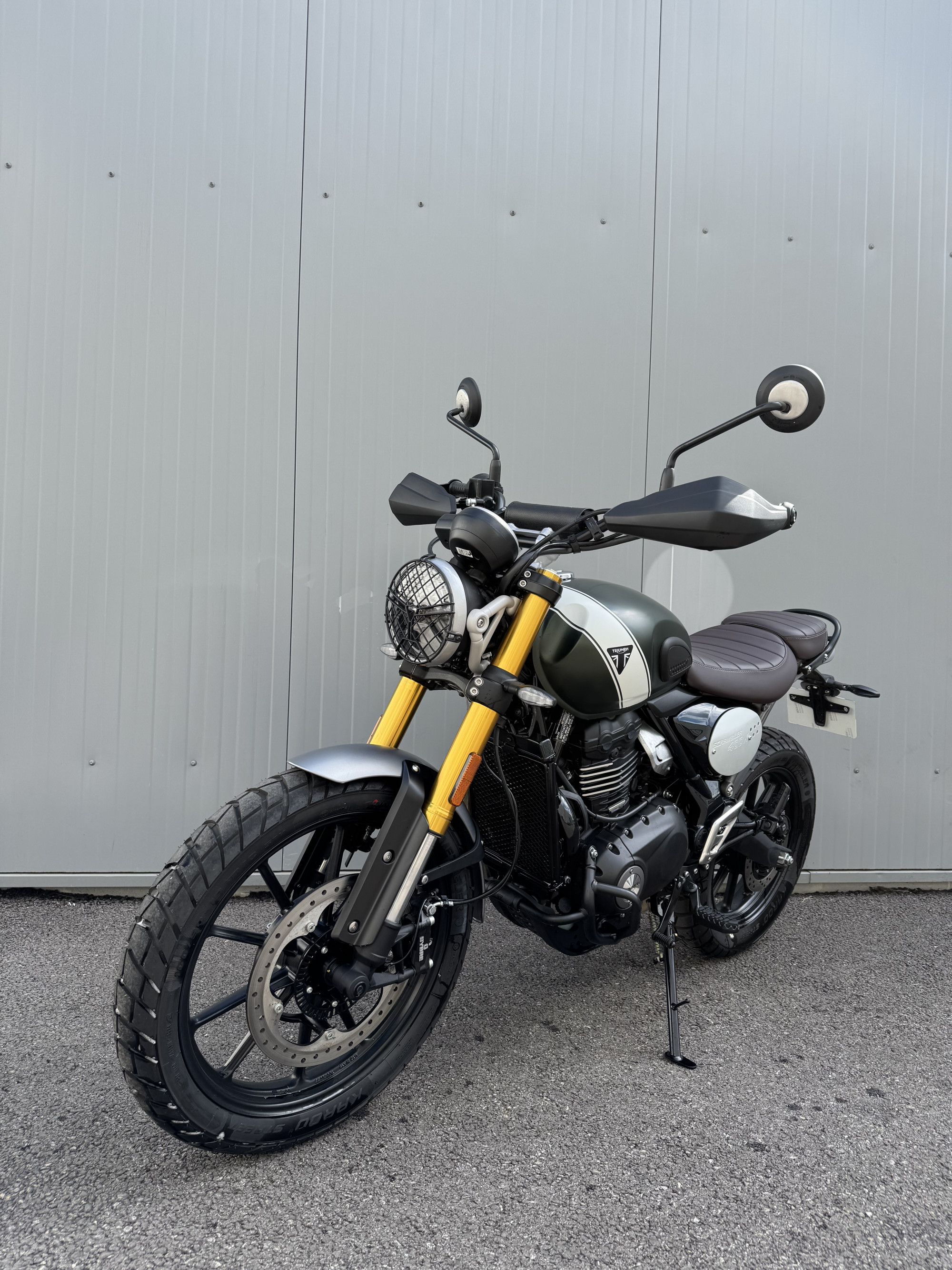 Moto feeling 73, votre concessionnaire exclusif TRIUMPH pour la Savoie, vous propose à la vente cette TRIUMPH SCRAMBLER 400 X coloris "Matt Kaki Green". Kilométrage certifié.